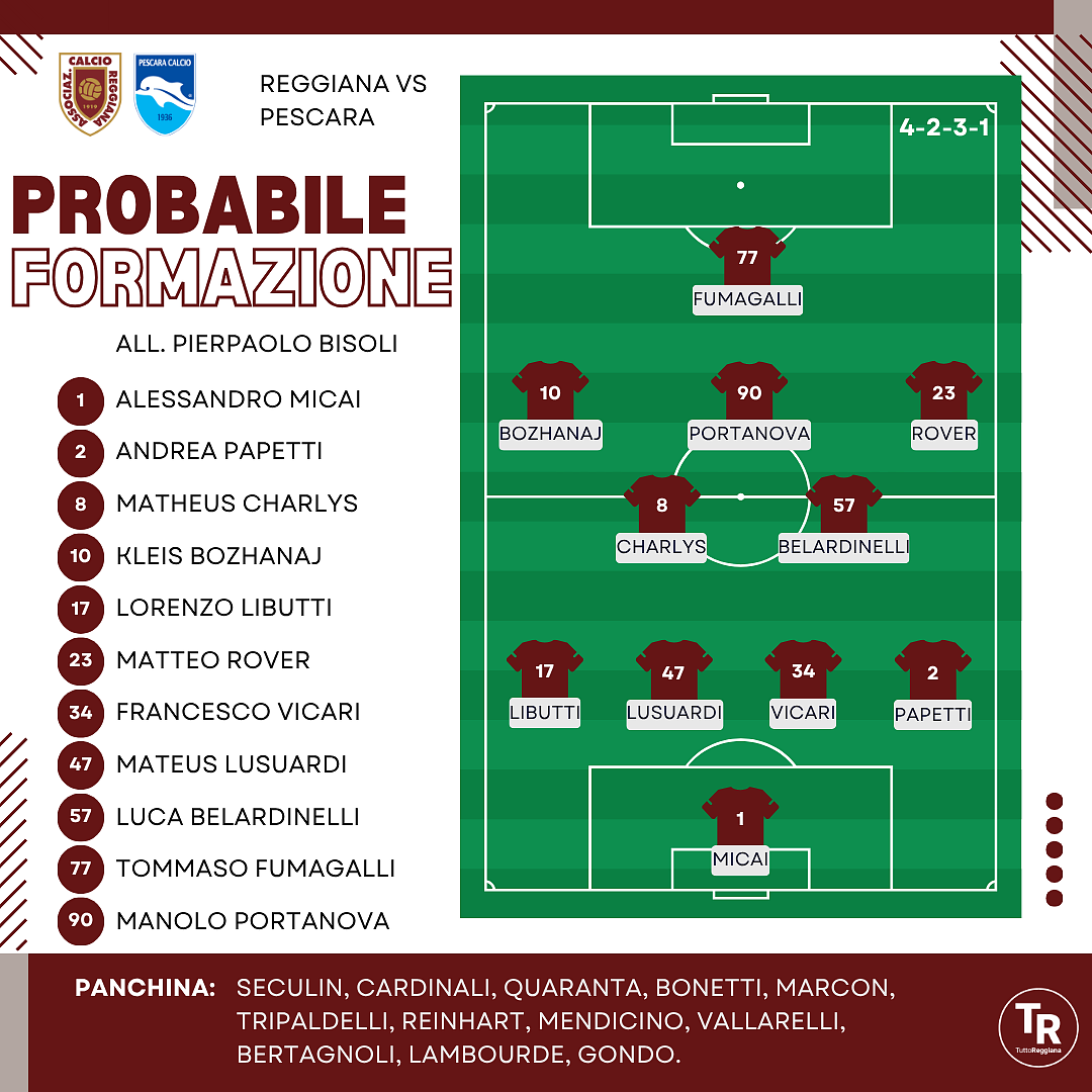 QUI REGGIANA. Mister Bisoli ha convocato 23 giocatori per la sua prima gara da allenatore granata: out gli infortunati Paz, Rozzio, Bozzolan, Sampirisi e Girma, oltre allo squalificato Novakovich. La novità principale sarà il cambio di modulo: la Regia dovrebbe schierarsi con il 4-2-3-1, con possibile passaggio al 4-3-3 a gara in corso. Tra i pali Micai ha recuperato; in difesa i centrali saranno Vicari (al debutto dal primo minuto) e Lusuardi. Sulle corsie laterali Papetti è in vantaggio a destra, con Libutti che potrebbe essere adattato a sinistra; l'alternativa è Bonetti, mentre Tripaldelli ha meno allenamenti nelle gambe. A centrocampo Reinhart, Bertagnoli, Vallarelli e Mendicino dovrebbero partire dalla panchina, con Belardinelli e Charlys a comporre la diga centrale. Sulla trequarti Portanova agirà in mezzo con Rover e Bozhanaj ai lati, ma Lambourde è stato provato a lungo da esterno destro e potrebbe rappresentare una sorpresa dall'inizio. In avanti Fumagalli sarà il riferimento offensivo, ma non è da escludere l'avanzamento di Rover se dovesse esserci Lamboude dal primo minuto. Gondo, rientrato stabilmente in gruppo, punta a trovare spazio nella ripresa.
