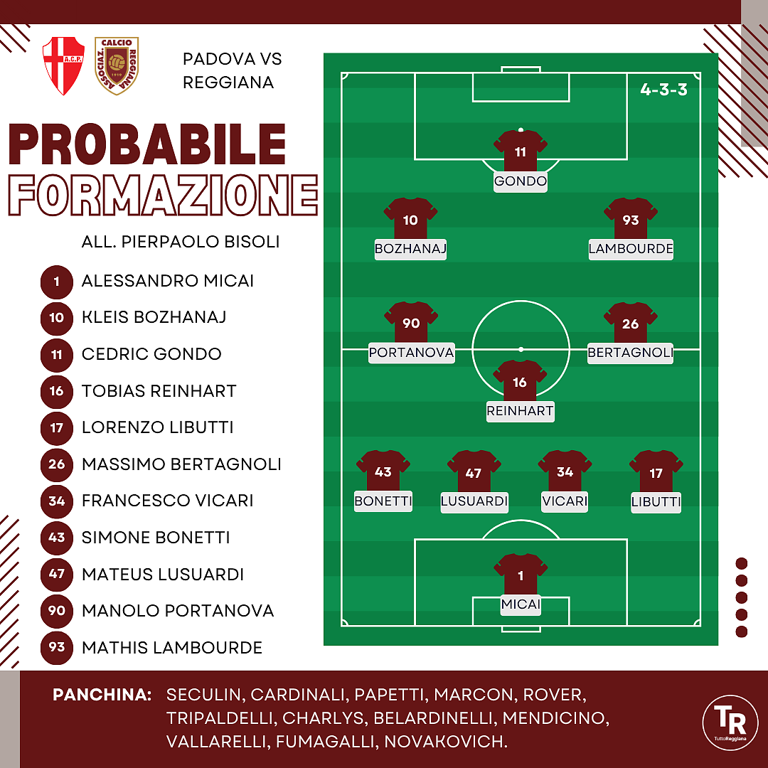 QUI REGGIANA. Mister Bisoli ha convocato 24 giocatori per la sfida contro i patavini: restano fuori gli infortunati Paz, Rozzio, Bozzolan, Sampirisi, Girma e Quaranta. Il tecnico granata ripartirà dal 4-3-3 visto contro la Carrarese, con la possibilità di cambiare modulo a gara in corso. In difesa unico dubbio sulla corsia sinistra, dove Bonetti è in ballottaggio con Tripaldelli, rientrato dalla squalifica. Per il resto conferme per Vicari e Lusuardi al centro davanti a Micai, con Libutti sulla destra; Papetti e Marcon rappresentano le alternative dalla panchina. A centrocampo Reinhart, Bertagnoli e Portanova sono praticamente certi di ottenere una nuova maglia da titolare, con Charlys, Belardinelli, Vallarelli e Mendicino pronti a subentrare. Nel tridente offensivo resta aperto il ballottaggio a sinistra tra Rover e Bozhanaj, con l’albanese leggermente favorito per partire dall’inizio accanto a Gondo e Lambourde. Più indietro nelle gerarchie Novakovich e Fumagalli.