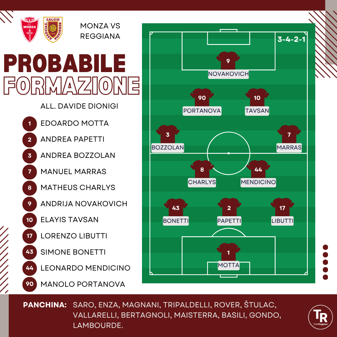 QUI REGGIANA. Mister Dionigi ha convocato 23 giocatori per la trasferta brianzola. Restano ai box gli infortunati Quaranta, Rozzio, Sampirisi e Seculin, ai quali in settimana si sono aggiunti Girma e Reinhart. Per il trequartista classe 2001 c’è la possibilità di un rientro in panchina nel derby, ma molto dipenderà dagli esiti degli esami strumentali delle ultime ore. Indefinita al momento la situazione del regista argentino: si sospetta una lesione muscolare che potrebbe tenerlo lontano dal campo per alcune partite. In difesa il dubbio principale riguarda sempre Magnani: il centrale di Fabbrico, ha spiegato Dionigi, giocherà da titolare una delle prossime tre gare; facile immaginare che possa toccare a lui nel derby di martedì sera. Per Monza, dunque, resta favorito il terzetto Libutti–Papetti–Bonetti. Tra i pali è disposizione Motta, con Saro come alternativa. Sulle corsie laterali le prime scelte restano Marras e Bozzolan, ma non è da escludere una rotazione: l’ex Milan Futuro potrebbe partire dalla panchina, lasciando spazio a Tripaldelli o a Rover, con conseguente slittamento di Marras sull’altro lato. In mezzo al campo, per sostituire Reinhart in cabina di regìa, tutti gli indizi portano al classe 2006 Mendicino. Štulac sta meglio ma non garantisce ancora il dinamismo richiesto, mentre Vallarelli e Bertagnoli restano opzioni alternative (il secondo per dare più fisicità). Sulla trequarti dovrebbe agire la coppia Portanova–Tavsan, ma non è da escludere che il numero 90 arretri sulla linea dei centrocampisti per un 3‑5‑2 o 3‑5‑1‑1. In attacco parte favorito Novakovich: Gondo punta al pieno recupero per il derby o per la successiva trasferta di Avellino. Attenzione però a Lambourde, fin qui spesso decisivo a gara in corso.