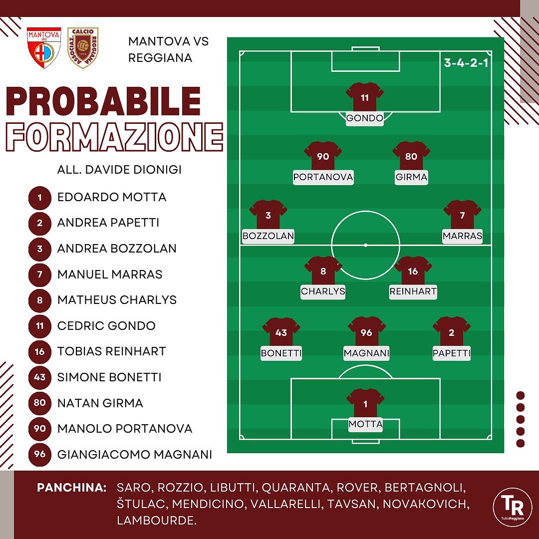 MANTOVA (4-3-3): Festa; Fedel, Castellini, Cella, Maggioni; Trimboli, Artioli, Wieser; T. Marras, Bonfanti, Ruocco. A disposizione: Andrenacci, Botti, Mullen, Pittino, Majer, Paoletti, Falletti, Galuppini, Mensah, Caprini, Fiori. Allenatore: Davide Possanzini.