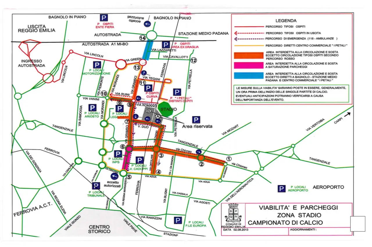 Definito il sistema della mobilità presso il “Mapei Stadium – Città del Tricolore” in vista dell’incontro Reggiana-Parma: come già accaduto in occasione della sfida con il Modena, Via del Chionso, Via delle Ortolane, Via Gramsci e Via Ruini a partire dal tardo pomeriggio saranno chiuse al traffico.