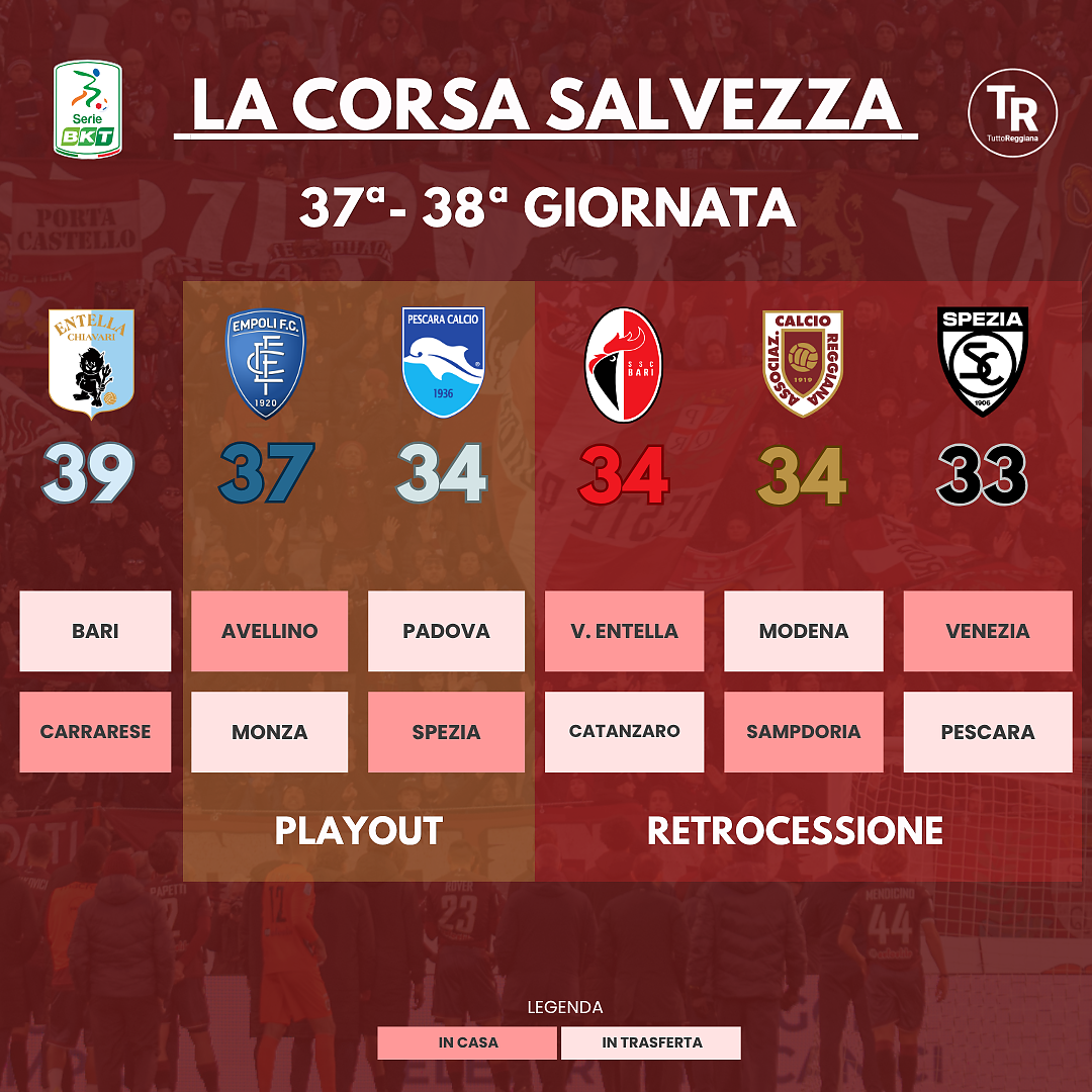 Vincere per restare aggrappati alla Serie B: la Reggiana non può permettersi di fare troppi calcoli nelle due partite che restano. Il campionato cadetto più intenso e meno scontato degli ultimi anni, a 180 minuti dal termine, non ha ancora emesso verdetti né in chiave promozione né in zona retrocessione, ma qualcosa potrebbe già cambiare il 1º maggio, quando tutte le squadre scenderanno in campo in contemporanea.