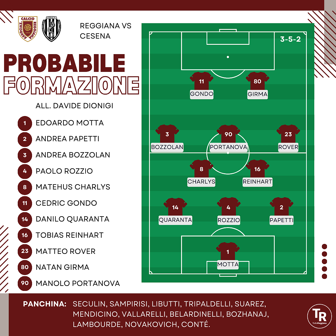 QUI REGGIANA. Come già accaduto nel precedente turno con il Venezia, la lista dei convocati da mister Dionigi sarà diramata solamente sabato mattina. Sicuramente mancheranno gli infortunati Bonetti e Bertagnoli, ma dovrebbero essere esclusi anche Saro e Štulac. In difesa scelte praticamente obbligate, con Papetti, capitan Rozzio e Quaranta a protezione della porta di Motta; in panchina scalpita Sampirisi, alla ricerca di ulteriori minuti per entrare in forma. Sulle corsie laterali Rover è in vantaggio su Libutti a destra, mentre a sinistra giocherà Bozzolan, con Tripaldelli pronto a subentrare nella ripresa. In mezzo al campo si potrebbe verificare l’abbassamento di Portanova da mezzala al fianco di Charlys e Reinhart, con il conseguente passaggio al 3-5-2. In panchina Vallarelli, Mendicino e gli ultimi arrivati Suarez, Belardinelli e Bozhanaj. In avanti rientra Gondo dopo il turno di squalifica per dar manforte a Girma, con Novakovich e Lambourde come armi da sfruttare a gara in corso.