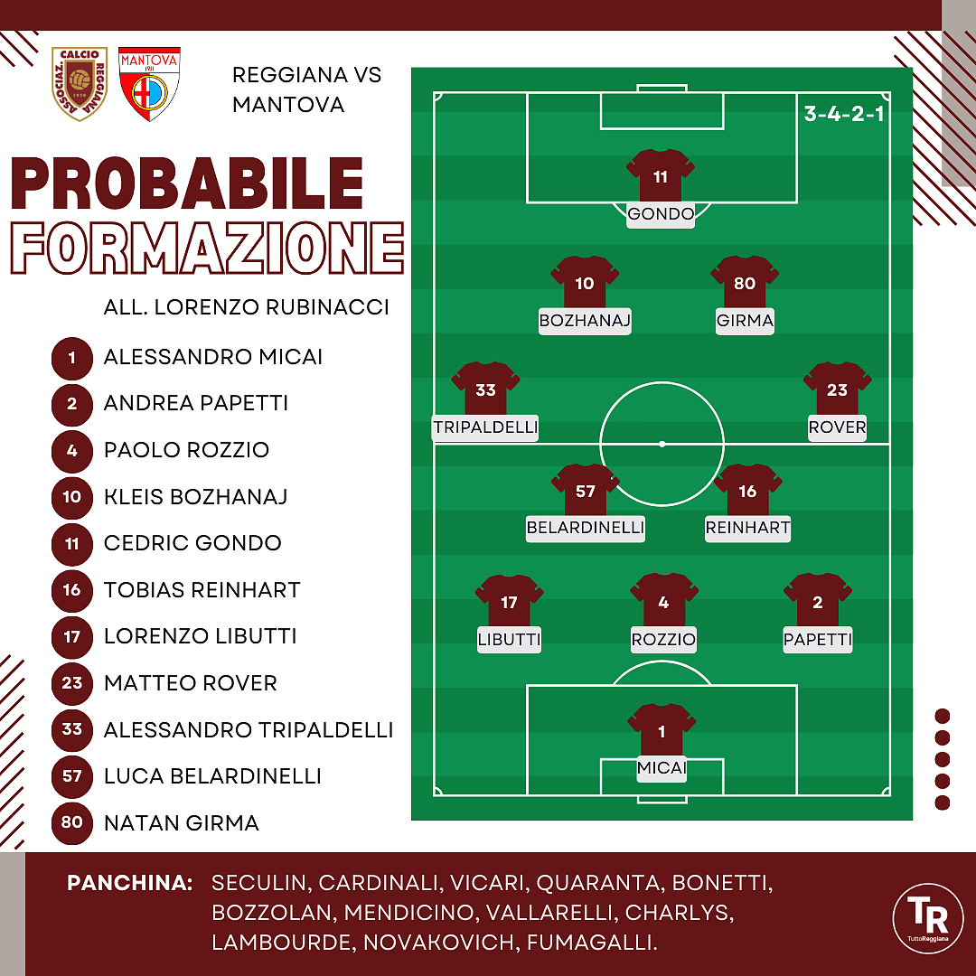 REGGIANA (3-4-2-1): Micai; Papetti, Rozzio, Libutti; Rover, Reinhart, Belardinelli, Tripaldelli; Girma, Bozhanaj; Gondo. A disposizione: Seculin, Cardinali, Vicari, Quaranta, Bonetti, Bozzolan, Mendicino, Vallarelli, Charlys, Lambourde, Novakovich, Fumagalli. Allenatore: Lorenzo Rubinacci.