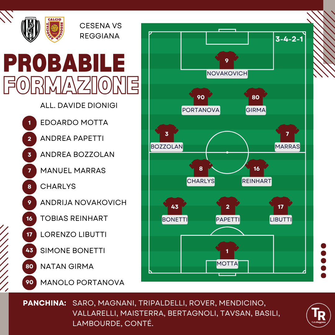 QUI REGGIANA. Mister Dionigi ha convocato 24 giocatori per il derby del “Manuzzi”. Restano indisponibili gli infortunati Quaranta, Štulac, Rozzio e Sampirisi, ai quali si è aggiunto Gondo, mentre dalla Primavera si aggregano nuovamente Maisterra e Conté. Nel consueto 3-4-2-1 granata le alternative in difesa restano limitate: davanti a Motta (torna a disposizione Seculin) agiranno Libutti, Papetti e Bonetti, con Magnani pronto a esordire a gara in corso. Sulla corsia destra dovrebbe essere confermato Marras, già schierato nel secondo tempo contro lo Spezia, con Rover in ballottaggio. A sinistra Bozzolan è favorito, ma Tripaldelli insidia una maglia da titolare. In mezzo al campo Reinhart e Charlys si sono messi in luce martedì, ma nell’ottica della gestione delle energie potrebbe tornare dal 1’ Bertagnoli, con Mendicino, Vallarelli e Basili pronti a subentrare. Sulla trequarti Portanova dovrebbe stringere i denti per la terza gara in una settimana, affiancato da Girma. Da valutare invece le condizioni di Novakovich: con Gondo ai box, l’attaccante statunitense resta l’unico riferimento offensivo, ma potrebbe iniziare dalla panchina dopo le fatiche di martedì. In tal caso Girma avanzerebbe nel ruolo di “punta”, con Tavsan ad agire sulla trequarti, oppure potrebbe toccare a Lambourde vestire i panni del riferimento più avanzato.
